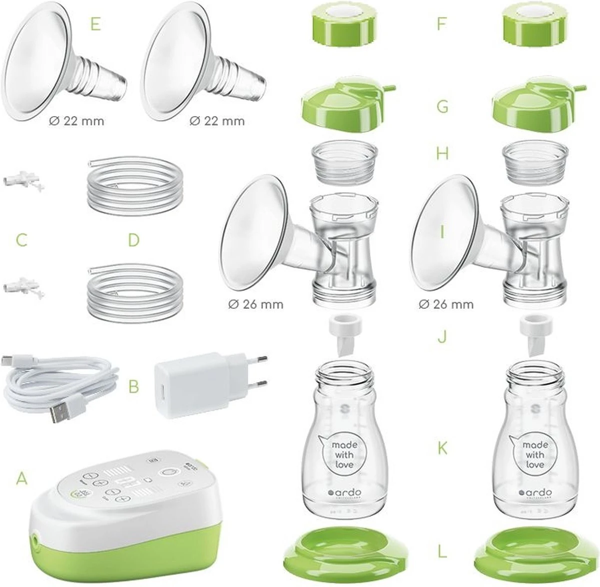 In de verpakking van de Ardo Alyssa Double borstkolf vind je 1 borstkolf, 2 afkolfsets met borstschelp maat 26 mm en 22 mm inzet, een power adapter met usb kabel en 2 losse, groene flessenhouders.