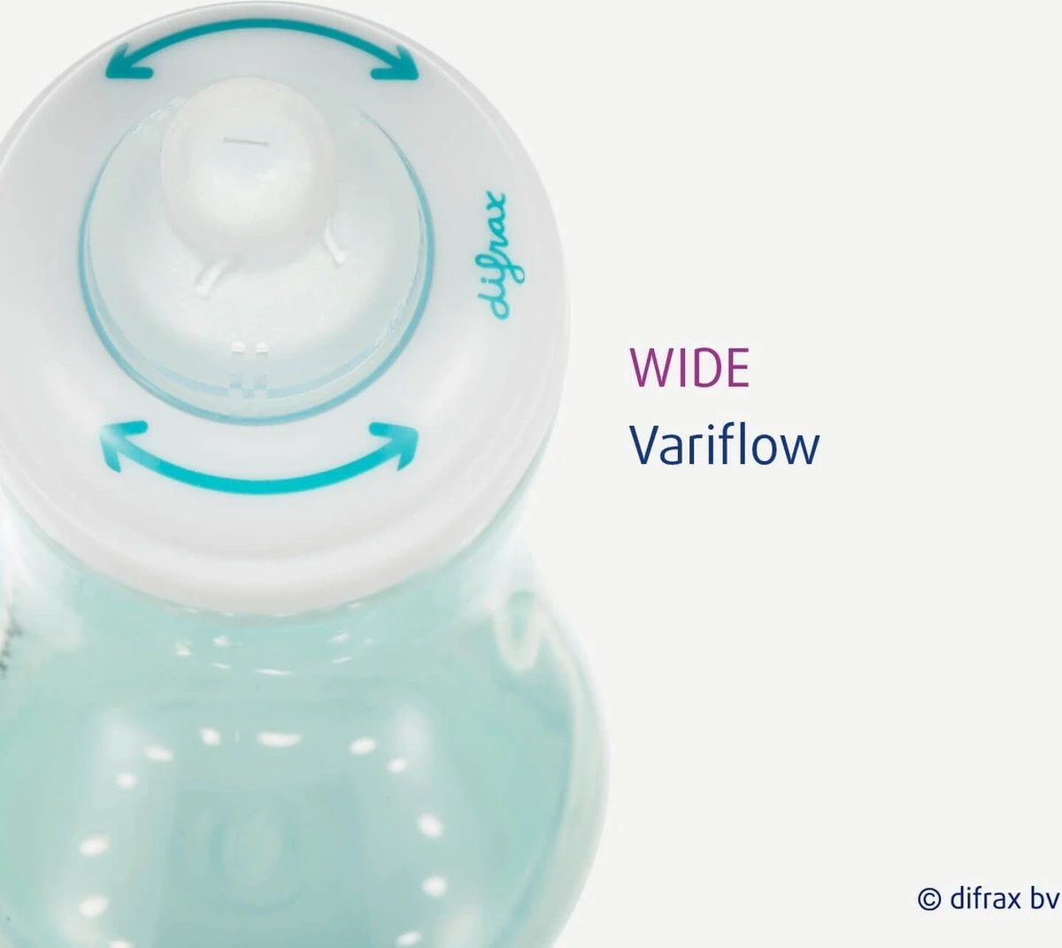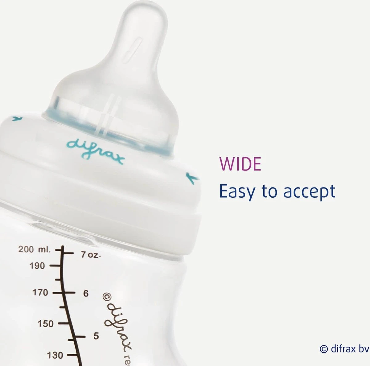 Geschikt voor flessen van: Past op alle varianten van de Difrax Anti-Colic S-fles Wide (200 ml en 310 ml), op Avent flessen en op andere merken brede babyflessen.
