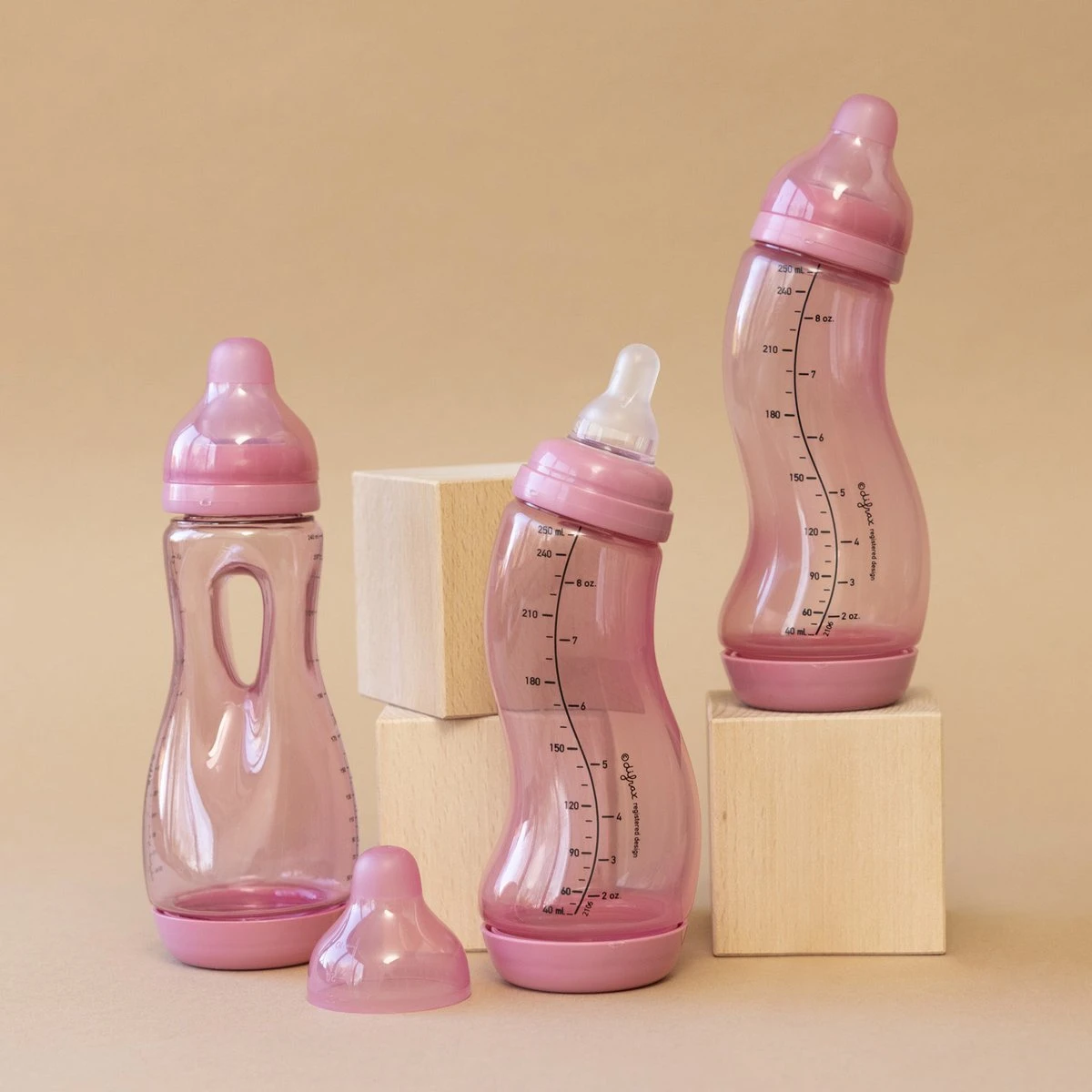 De roze 250 ml Difrax S-fles heeft een unieke S-vorm die zorgt voor een constante stroom van voeding. Het speciale ventiel in de bodem zorgt ervoor dat lucht niet mengt met de voeding, hierdoor blijven alle voedingsstoffen behouden.