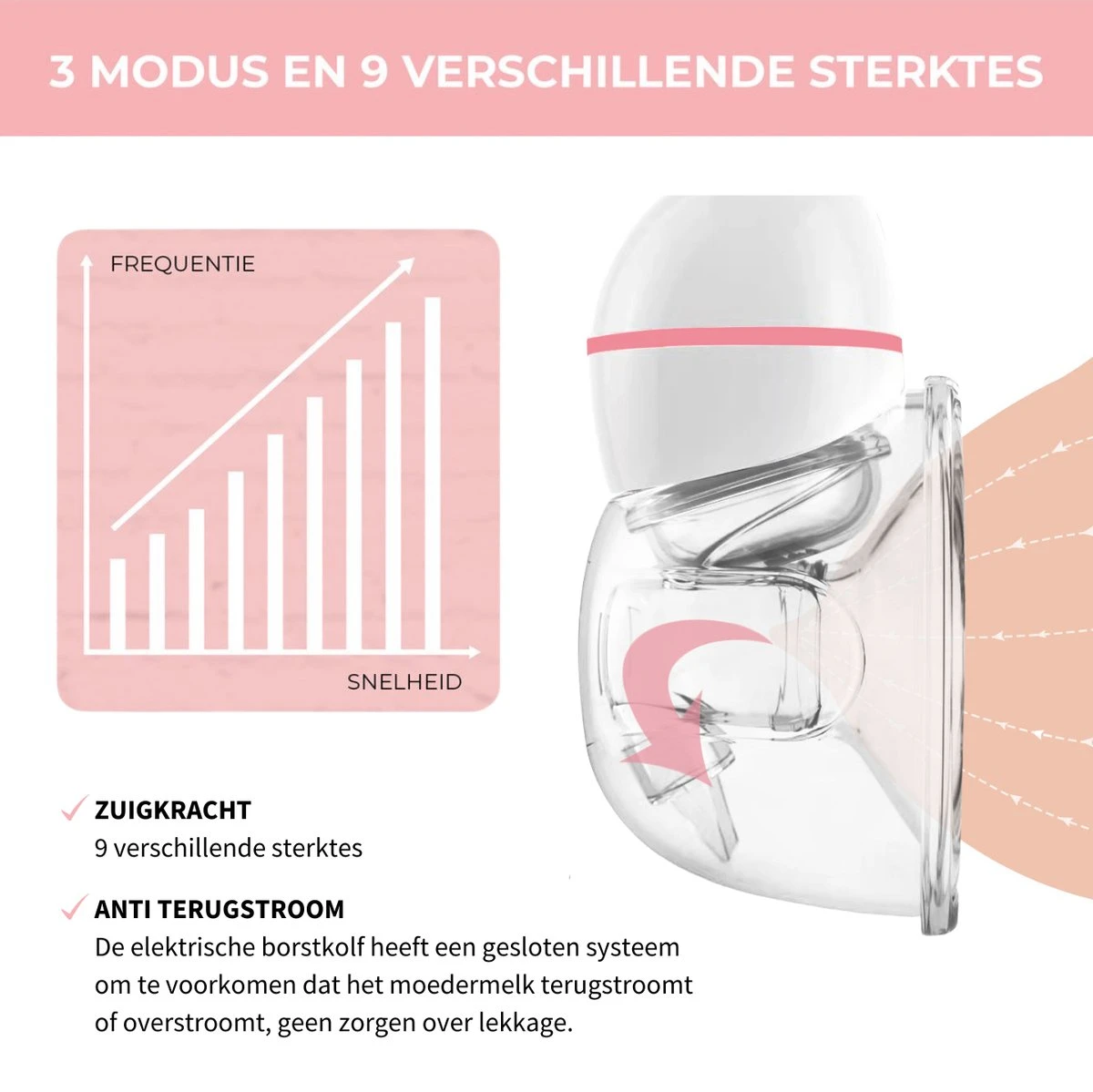 De kolf is voorzien van 9 verschillende zuigsterktes. Zo kun je zelf instellen welke sterkte je wilt gebruiken tijdens het kolven. Zo is er altijd een sterkte die aangenaam aanvoelt en waar je rustig en op je gemak mee kunt kolven.