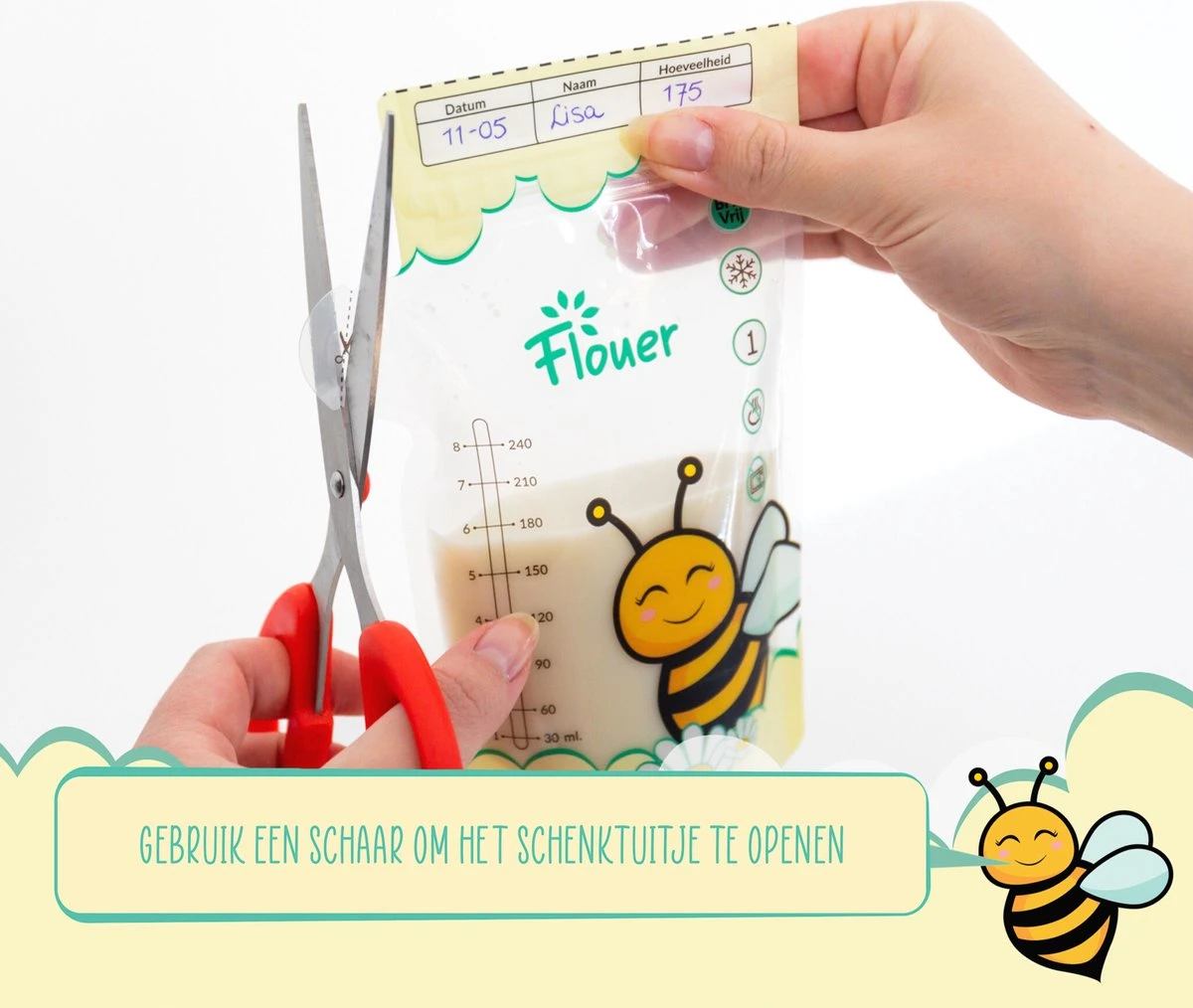 Door de flexibiliteit van de zakjes kan de aangegeven hoeveelheid van de maatstreep afwijken van de daadwerkelijke hoeveelheid. Wij adviseren je daarom de maatstreep op de zakjes puur als indicatie aan te houden. En in plaats daarvan de hoeveelheid aan te nemen die wordt aangegeven op het kolf flesje of de melk af te wegen.