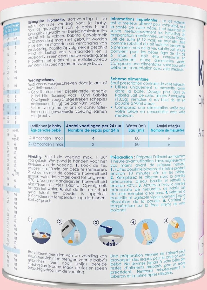 Borstvoeding is de beste voeding voor je baby. Lukt het niet (meer) om borstvoeding te geven of wil je het (deels) afbouwen, dan kan Kabrita 2 Opvolgmelk gebruikt worden vanaf 6 maanden. Kabrita 2 Opvolgmelk wordt gemaakt van geitenmelk van hoge kwaliteit. Het bevat vitamines, mineralen en zorgvuldig geselecteerde ingrediënten zoals geitenwei-eiwit, omega-3-vetzuren DHA en prebiotische vezels GOS.