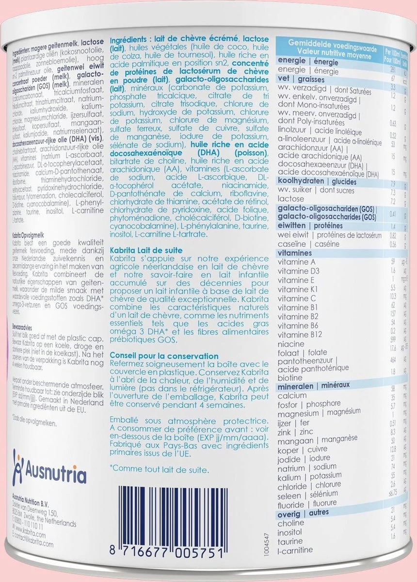 | Ingrediënten | Magere geitenmelk, lactose (melk), plantaardige oliën (kokosnootolie, raapzaadolie, zonnebloemolie), hoog sn-2 palmitinezuur olie, geitenwei eiwit concentraat poeder (melk), galacto-oligosachariden (GOS) (melk), mineralen (calciumcarbonaat, tricalciumfosfaat, trikaliumcitraat, trinatriumcitraat, natriumchloride, kaliumhydroxide, kaliumchloride, magnesiumchloride, ijzersulfaat, zinksulfaat, kopersulfaat, mangaansulfaat, kaliumjodide, natriumselenaat), docosahexaeenzuur-rijke olie (DHA) (vis), cholinebitartraat, arachidonzuur-rijke olie (AA), vitamines (natrium L-ascorbaat, L-ascorbinezuur, DL-α-tocopherylacetaat, niacinamide, calcium-D-pantothenaat, riboflavine, thiaminehydrochloride, retinylacetaat, pyridoxinehydrochloride, foliumzuur, fytomenadion, cholecalciferol, D-biotine, cyanocobalamine), L-phenylalanine, taurine, inositol, L-carnitine L-tartrate. |